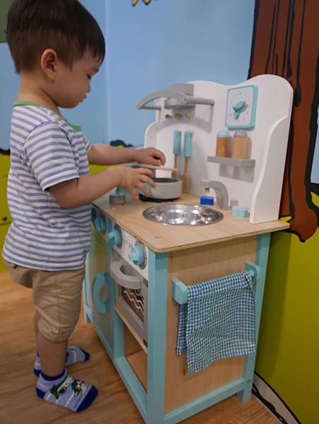 因為覺得木製廚具組比較耐用及有質感,私心又希望不要是親子館太常見的款式感覺比較有趣